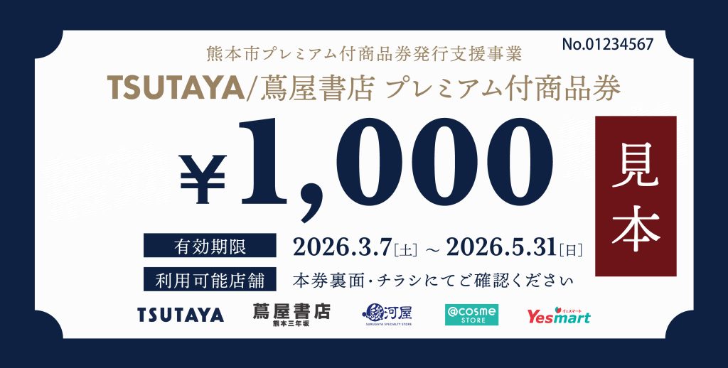 熊本市内のTSUTAYA/蔦屋書店(一部系列店舗含む)で使用できる、1セット5,000円で7000円分使えるお得な商品券です。